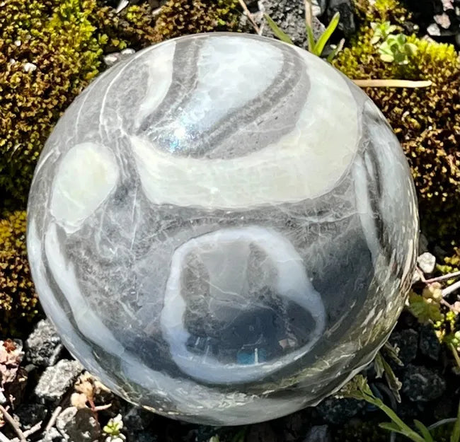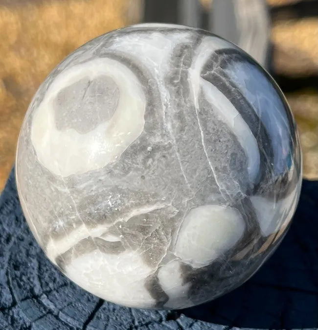 Thousand Eye Jasper Sphere that measures 2 1/2 inches in diameter. This is also know as Shell Jasper or Shell Marble and in China it is called Thousand Eye. It is marketed as jasper, however, it is actually marble, a metamorphic limestone, with a compact crystalline texture and can be polished to a high gloss. It has mottled black, white and gray colored patterns that can appear as a conglomerate group of fossils.