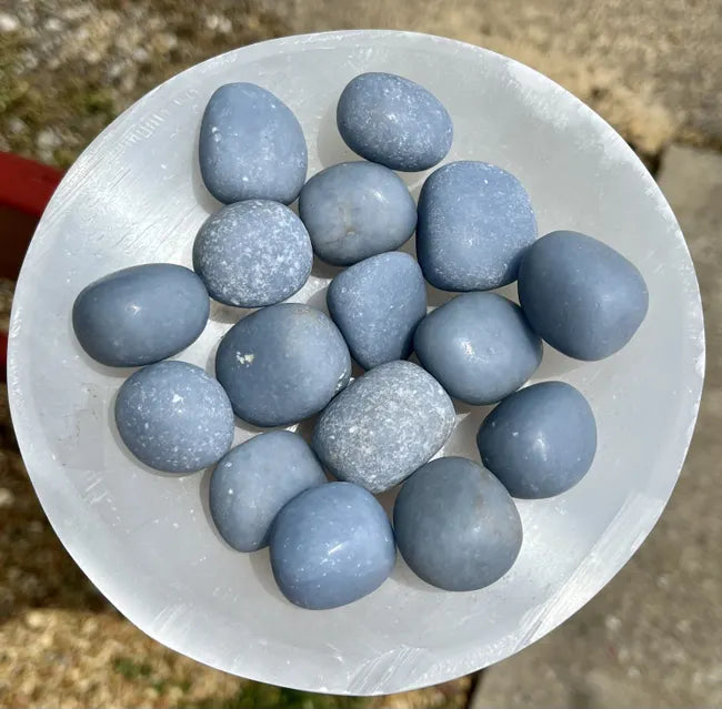 Angelite tumbled stones. They measure approximately 1" by 1". Your stone will be intuitively chosen for you. If you have specific requests please message or include in your comments. We will try to accommodate it.