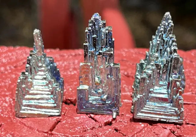 Bismuth castle formations that measure approximately 2 inches tall. Bismuth is a natural element that when melted and quickly cooled, it crystalizes into ornate, rainbow formations. These happen to look like tiny castles.