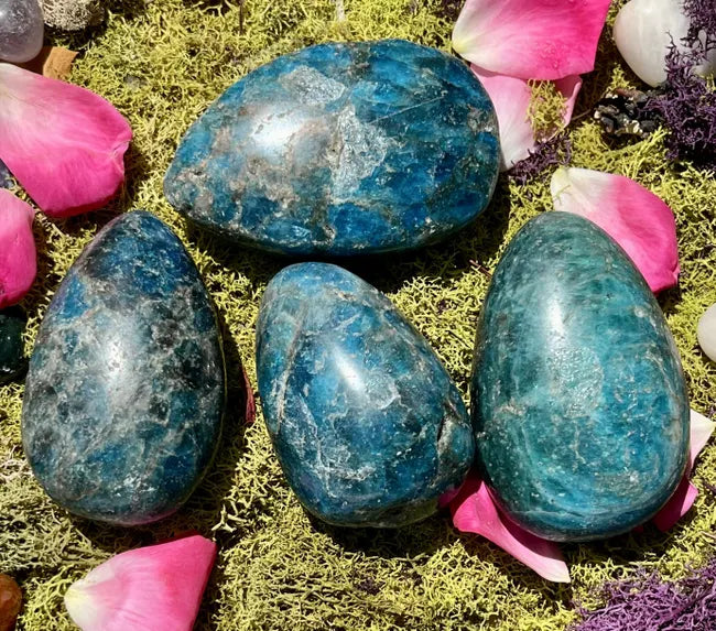 Blue Apatite palm stones. They are approximately 3" by 2". Your stone will be similar to the ones in the picture and will be intuitively picked. If you have a request or specific attribute message or add it to the comment and we will try to accommodate.
