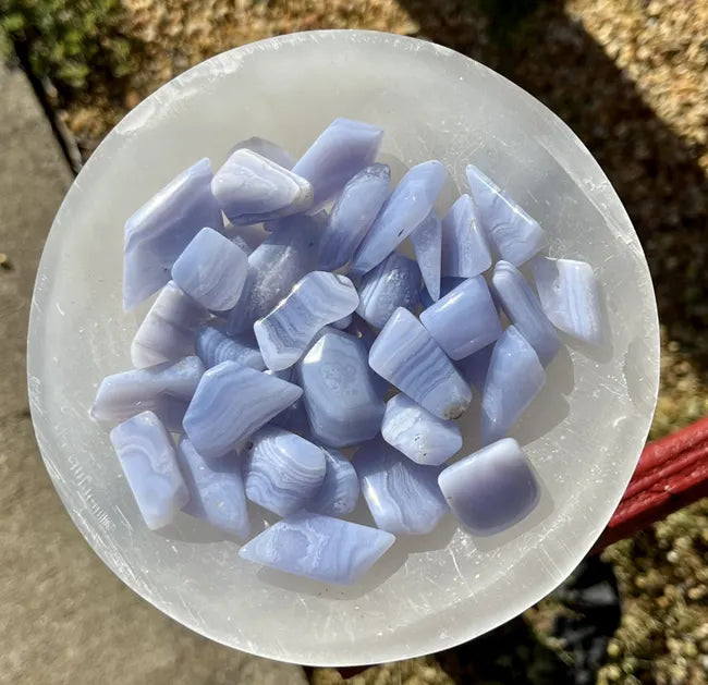 Blue Lace Agate tumbled stones. They measure approximately 1". Your stone will be intuitively chosen and will be similar to what is shown in the picture. If you have specific requests or attributes, please message or include in the comment and we will try to accommodate it.
