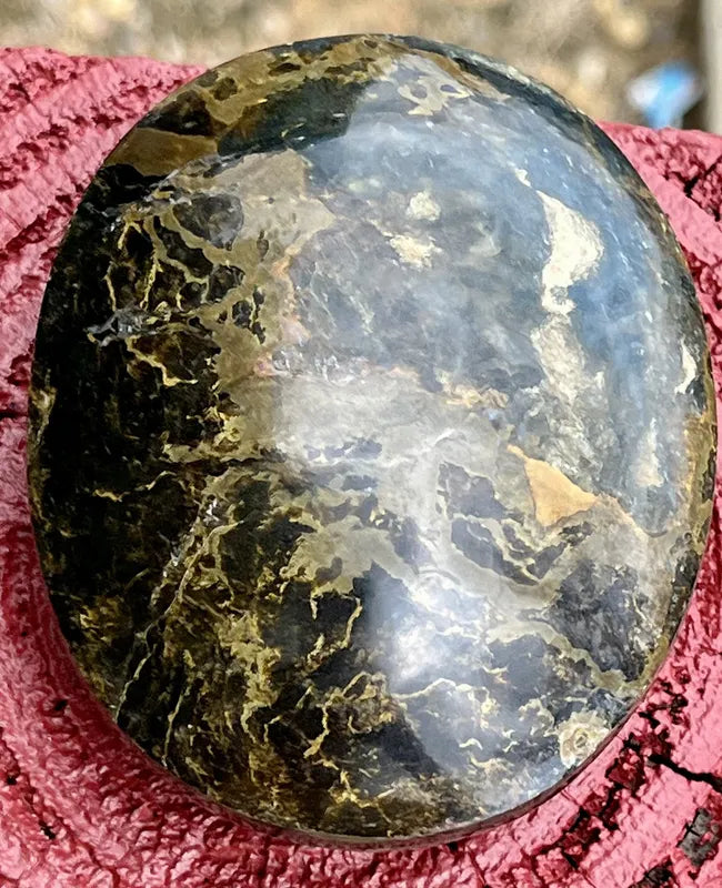 Blue Opal Mizone large palm stones. These measure 3 inches by 2 inches. This is a new discovery from Indonesia with patterns of deep blue, gray and rivers of bronze and brown.