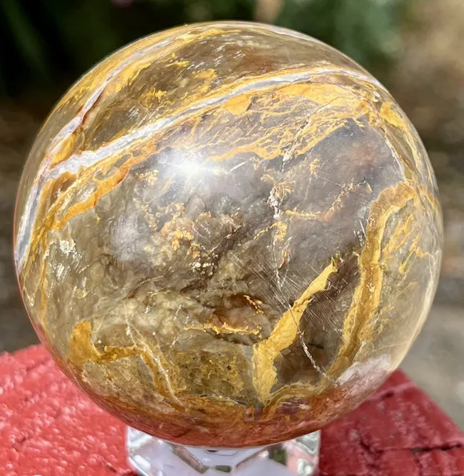 Blue Opal Mizone Sphere. It measures 2 inches in diameter. This is a new discovery from Indonesia with patterns of deep blue, gray and rivers of bronze and brown.