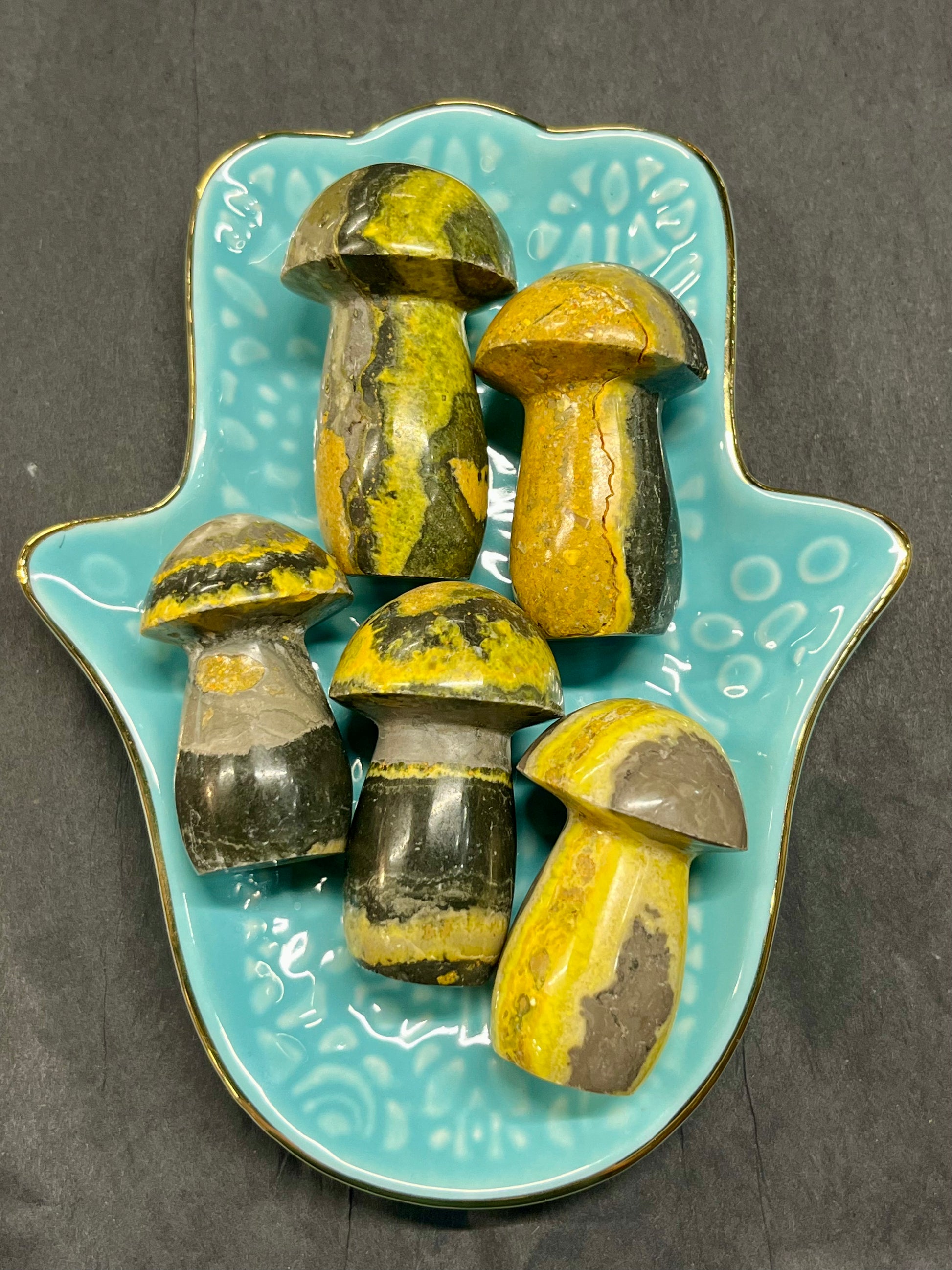 Bumblebee Jasper mushrooms. They measure approximately 2 inches tall. The black and yellow colors are very vibrant. Your stone will be similar in color and size in the pictures. They will be intuitively chosen.
