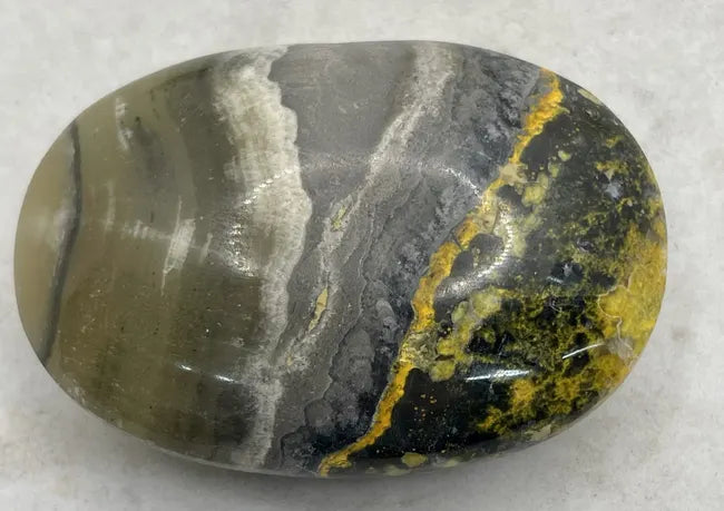 Bumblebee Jasper is a rare material that comes from only one location in the world, Mount Papandayan, West Java in Indonesia. It is a form of fibrous Calcite and is not actually a true Jasper because it does not contain Quartz. The distinctive yellow/orange color comes the mineral realgar.