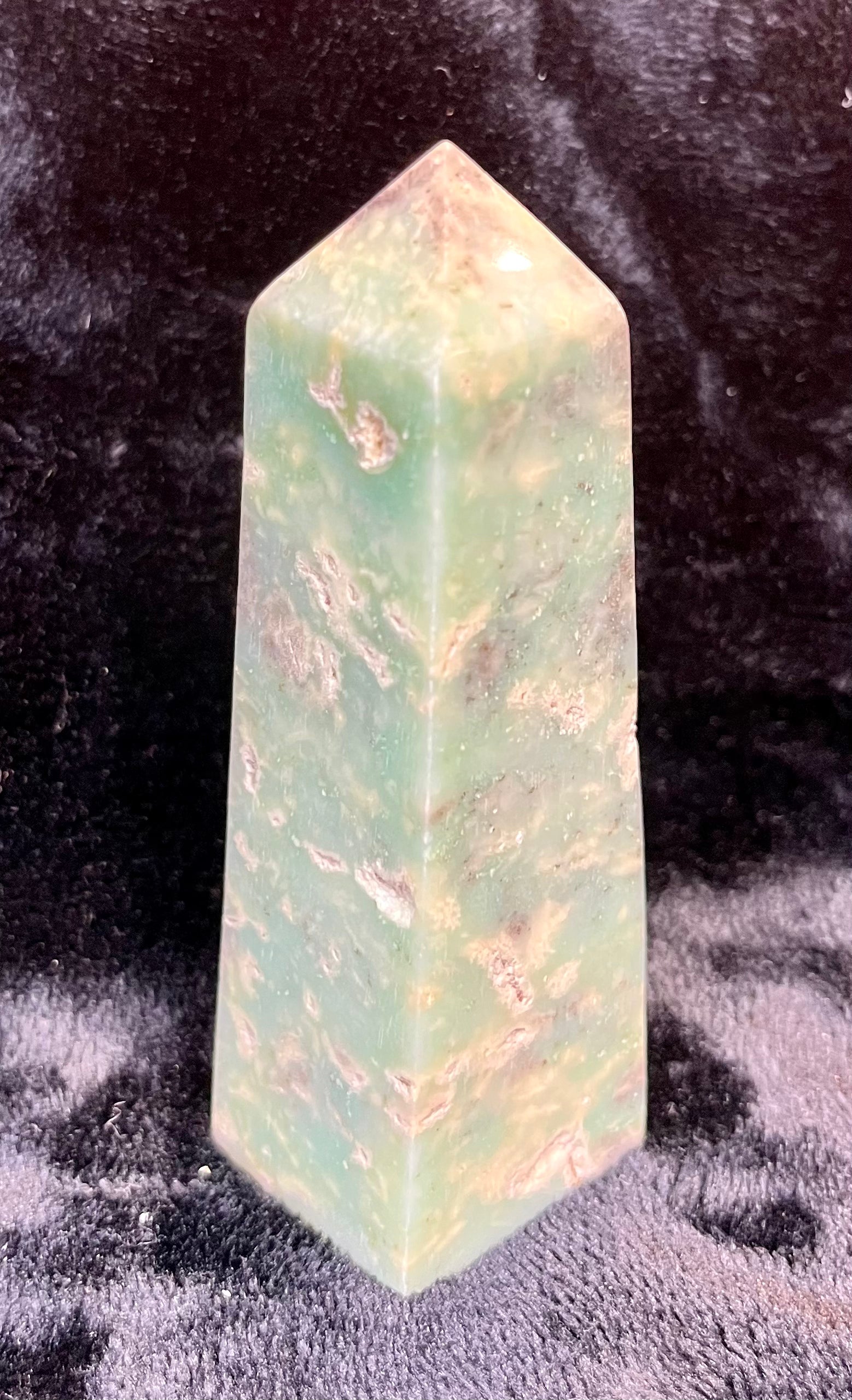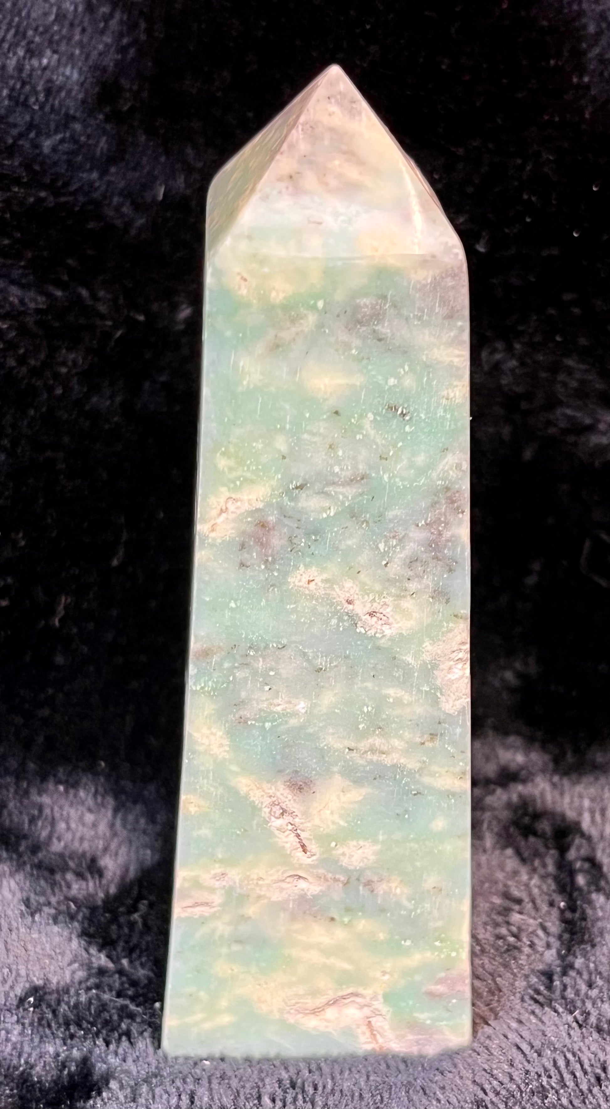 Beautiful Chrysoprase tower that measures 3 1/5 inches tall. The color is a calming green. The inner layers and white and brown colors are still visible. You will receive a tower similar in size and color as the ones pictured.