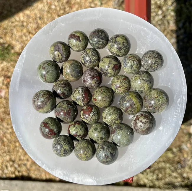 Dragon's Blood Spheres that measure 1/2". Dragon's Blood Jasper is an unusual mix of Epidote and red Piemontite, only found in Western Australia. According to the legend, Dragon's Blood was thought to have been the remains of dragons, a mixture of green skin and the red blood.
