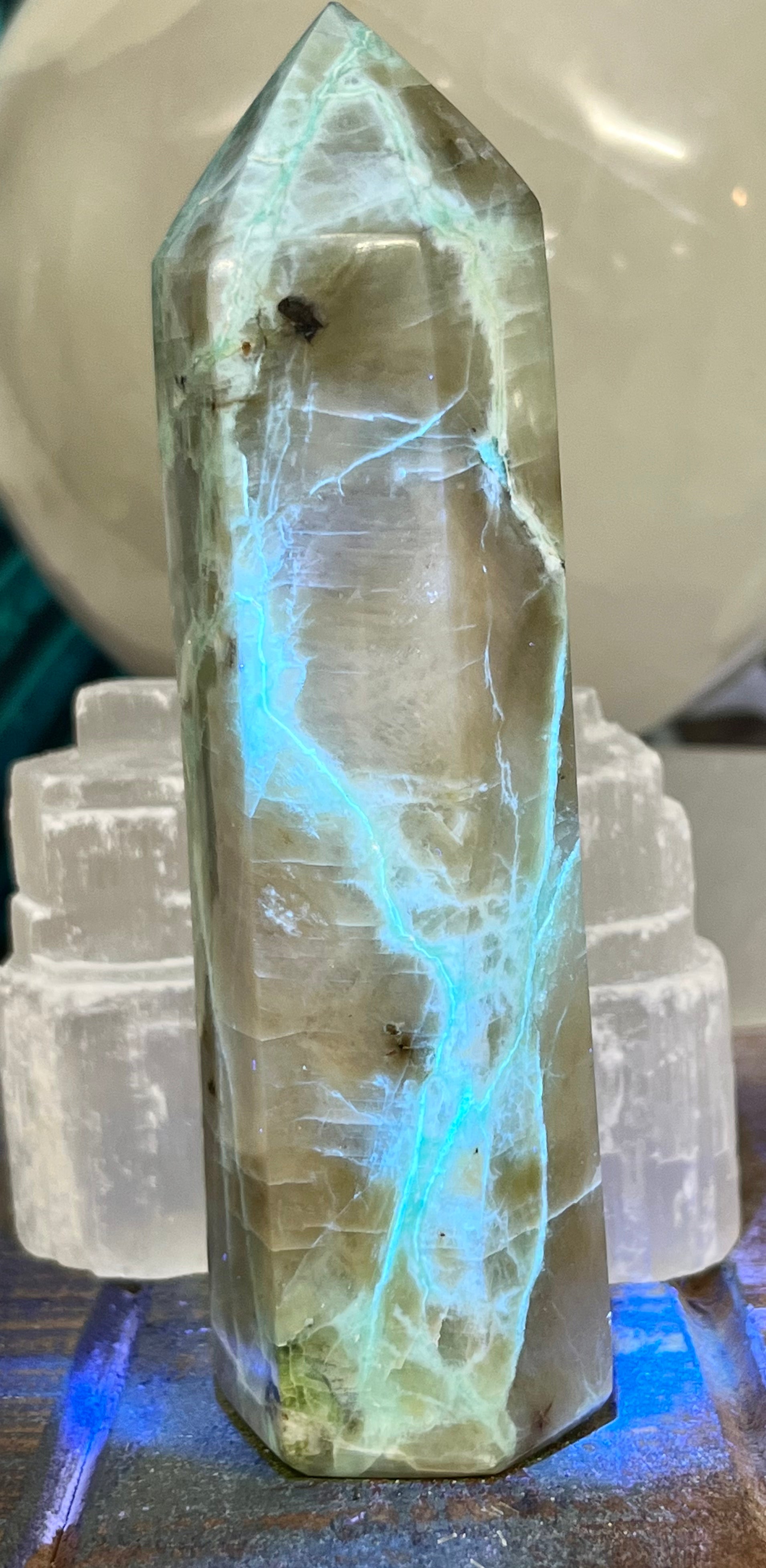 Green Moonstone or Garnierite It is an excellent stone for meditation, the Heart Chakra, recharging and focus. The tower is approximately 5 inches tall.