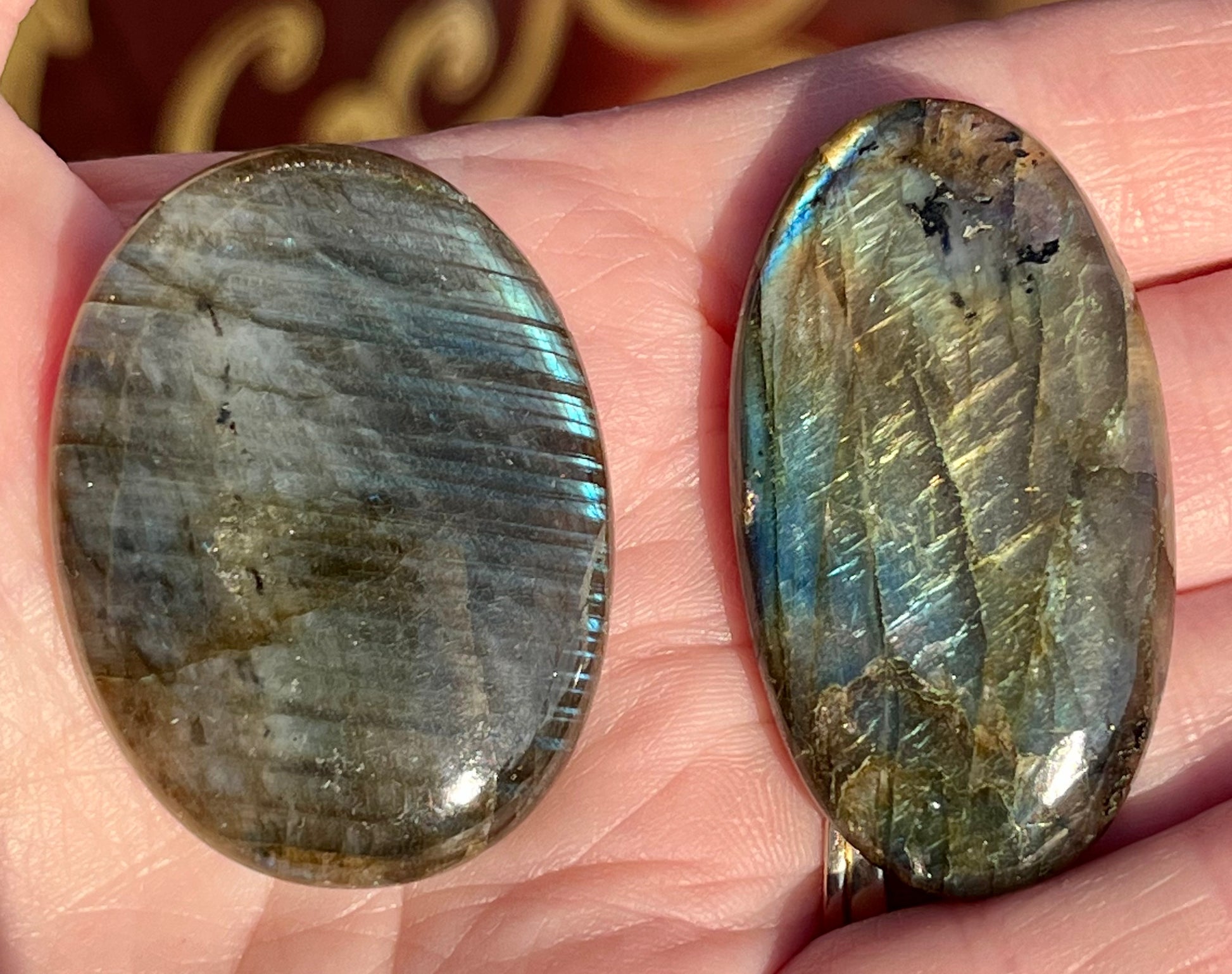 Labradorite Cabochon that measures 2 inches by 1 inch. And with amazing flash from vibrant blues to golden sheen.