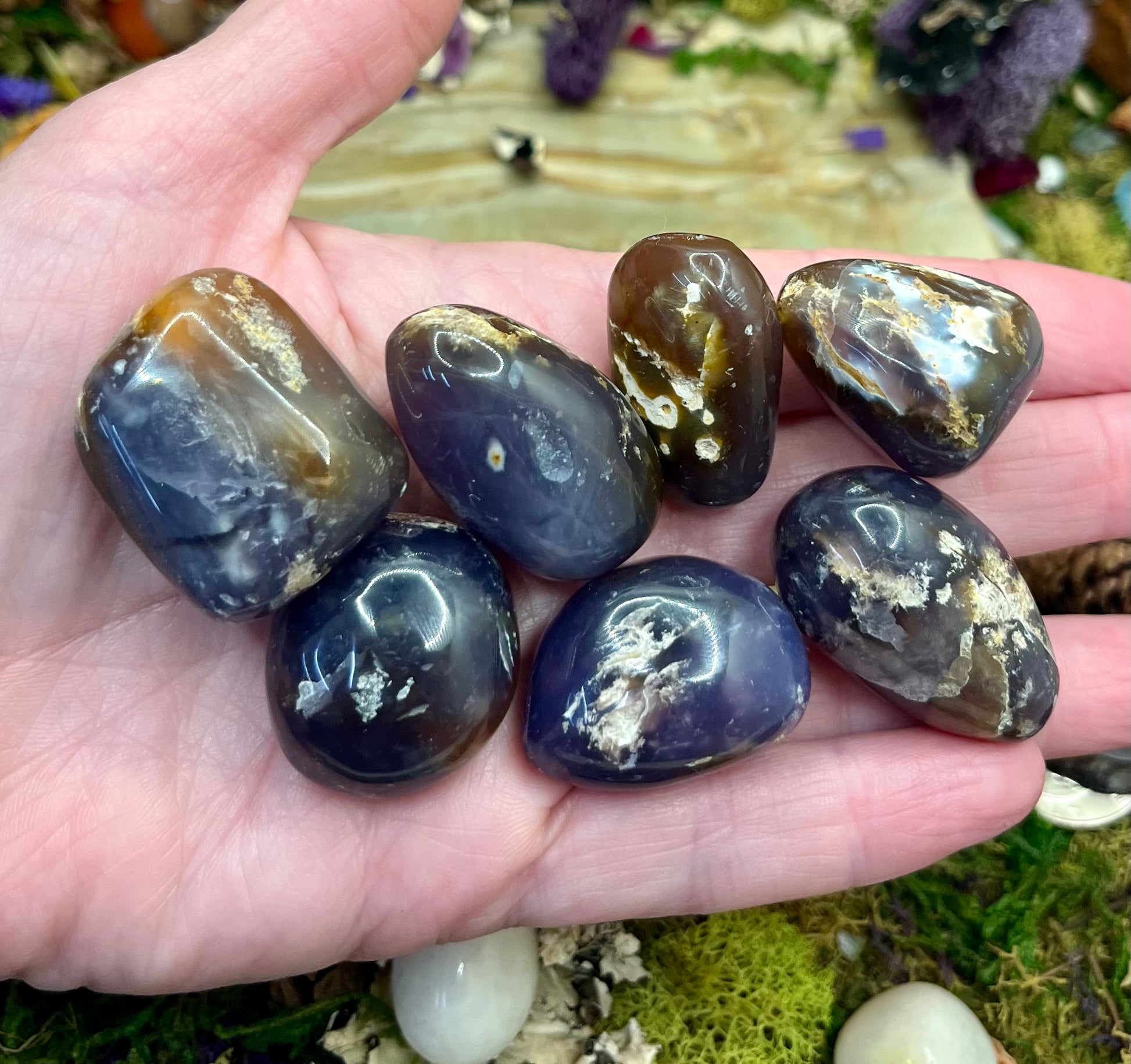 Purple Chalcedony from Indonesia ranges from a deep purple - blue color, to a much more pastel shade of purple, often displaying white markings similar to Orca Agate.