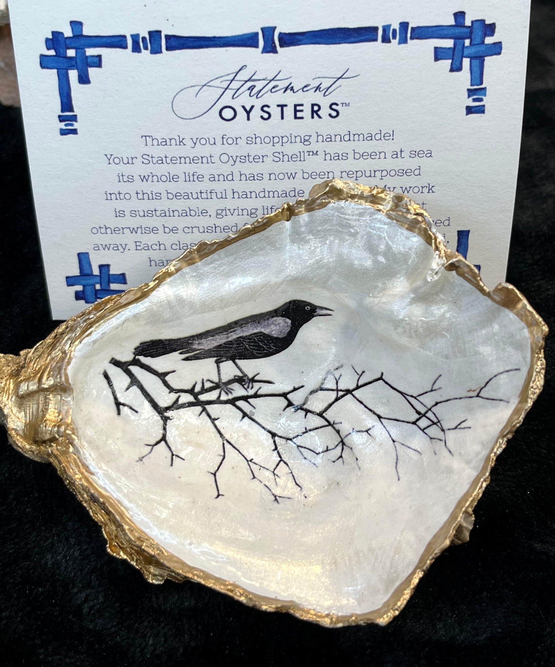 The traditional Raven sitting on a branch hand painted on an Oyster shell. Each piece is a one of kind. The natural shell measures 3 inches by 4 inches. The outer rim and back of the shell is painted gold. This is the perfect vessel to hold rings or special stones.