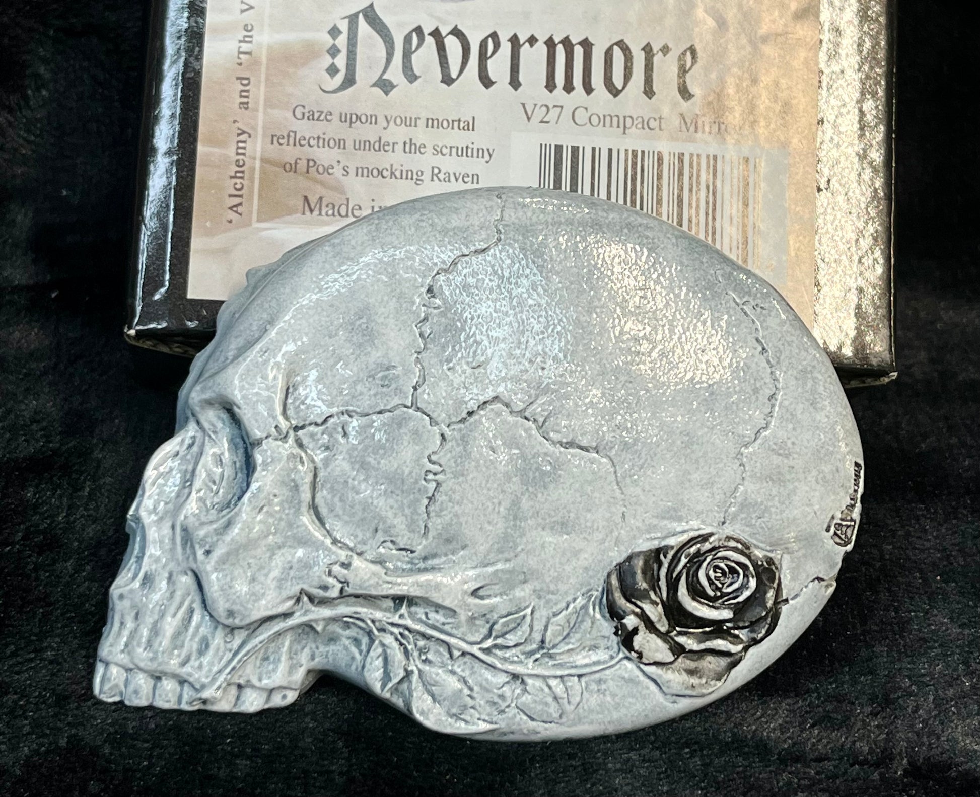 Beautiful compact mirror by Alchemy of England. The mirror has Poe's Raven adorning the front and the back has the appearance of a skull. The perfect size for a purse, pocket or dressing table. It includes a nice gift box as well.