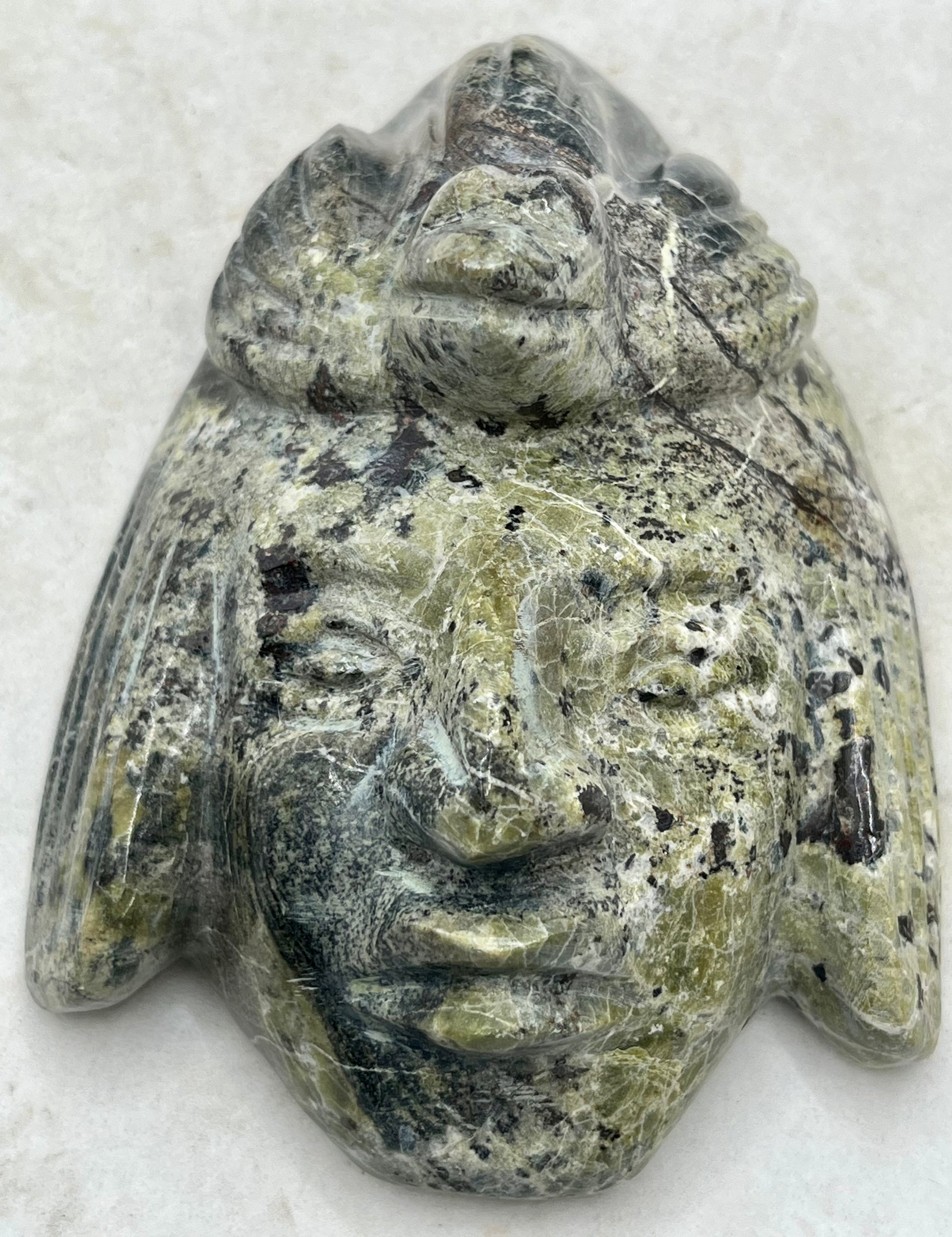 Aztec mask carved out of Soapstone. The colors range from various shades of green and white. It measures 5" by 3 1/2"