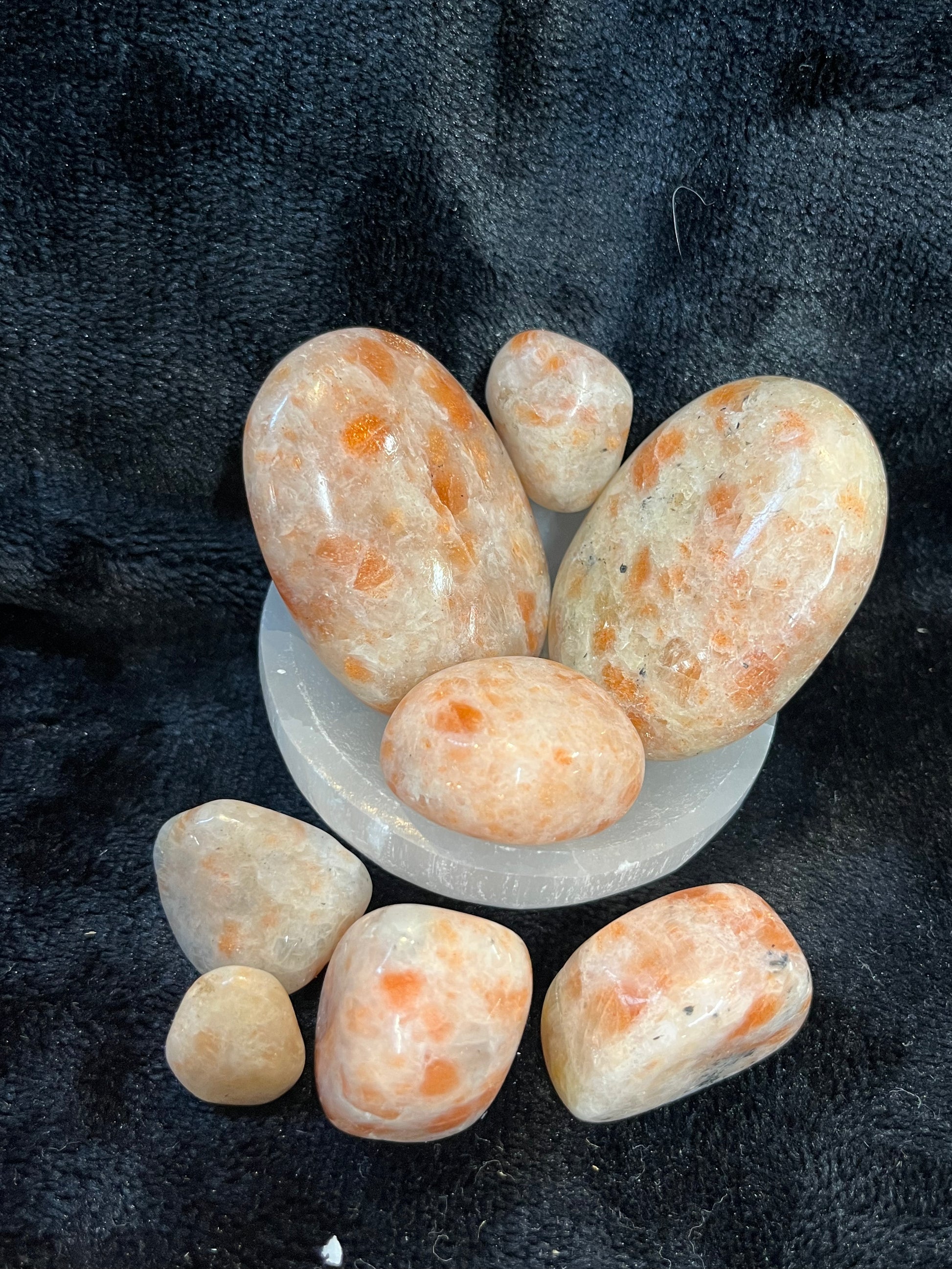 Sunstone Palm stones that measures 1 1/2 by 2 inches tall and wide. This variety of Sunstone has distinct copper flashes. Your crystal will be similar is size and color and will be intuitively chosen for you.
