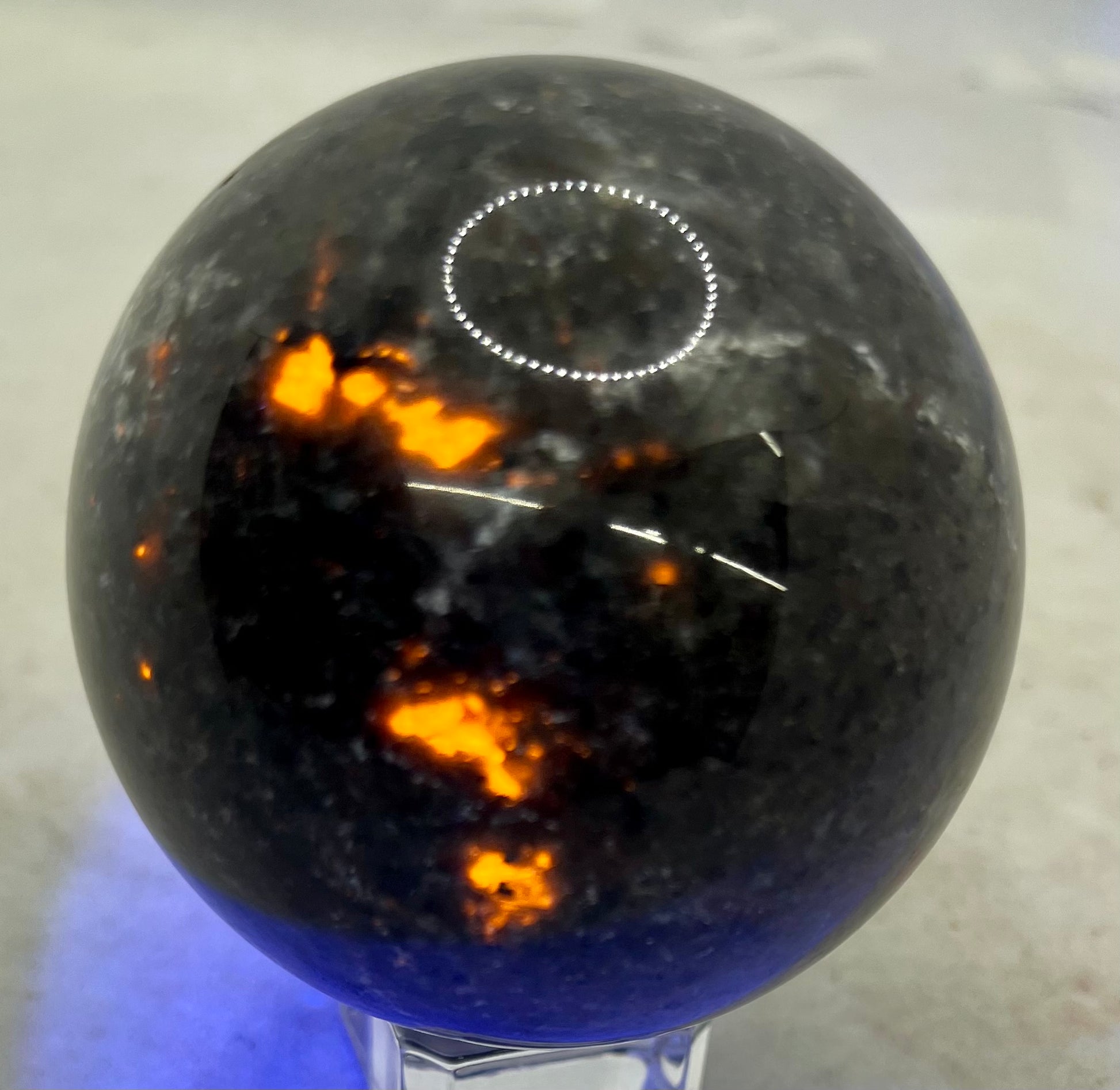 Yooperlite sphere that measures 2 1/2 inches in diameter. It is UV reactive.